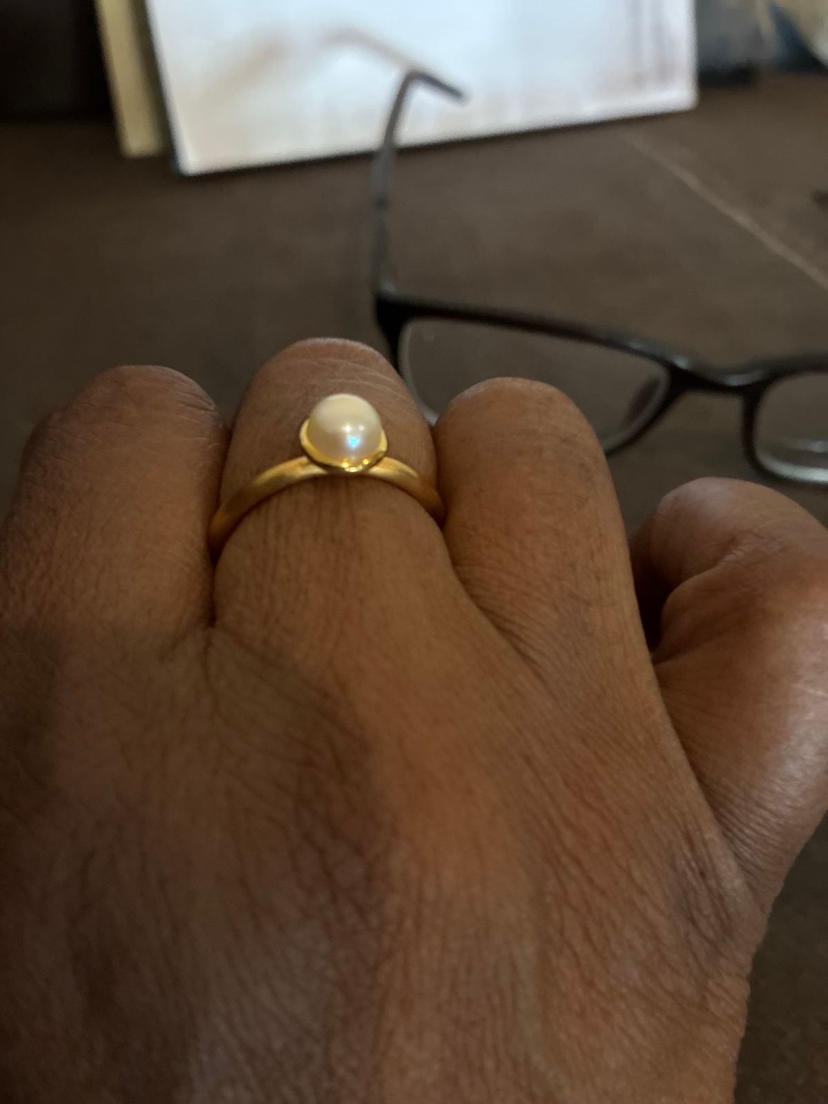 • We can never have enough dainty gold rings—and this one adds elegance to any stack with a small freshwater pearl surrounded by a polished rim to add to its glow.