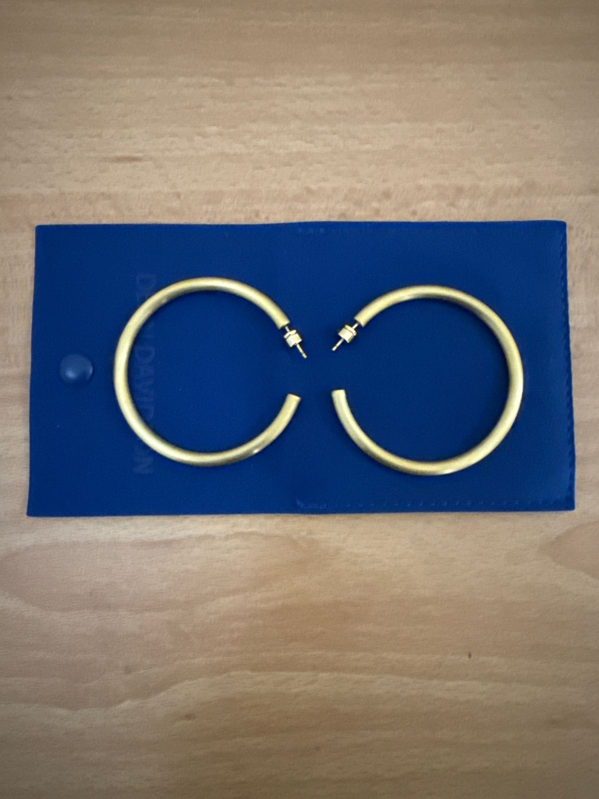 These stunning earrings are to die for!! Literally nothing compares I know I have an entire Dean Davidson jewelry box, everything he designs and makes is done with love and perfection. These are my favorite hoops ever and I got them in a large and they were not too big they were just perfect and the color and the sheen and the gold is just magical. All that glitters is gold with Dean Davidson donโ€™t sleep on these ladies.